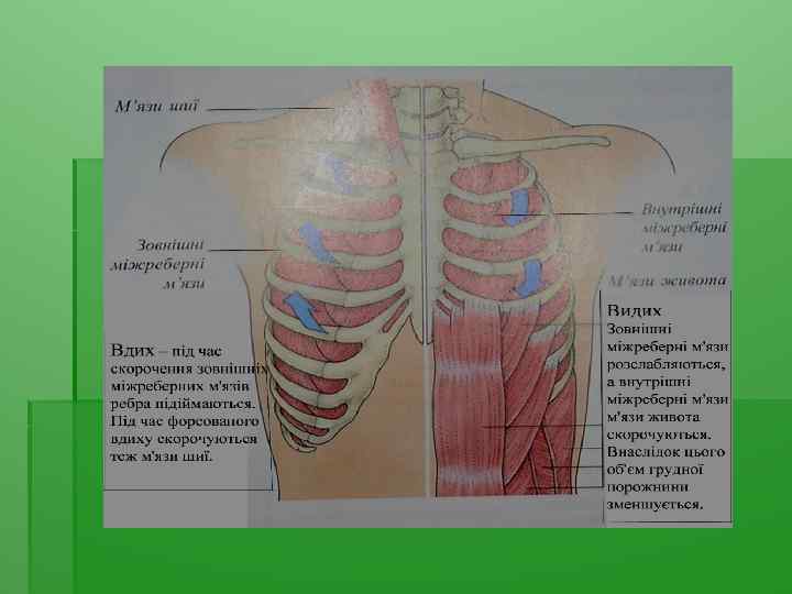 § Обмін газів між атмосферним повітрям і повітрям, що знаходиться в альвеолах, відбувається завдяки ритмічному чергуванню актів вдиху і видиху. § В легенях немає м’язової тканини, і тому активно вони скорочуватися не можуть. Активна роль в акті вдиху і видиху належить дихальним м’язам. При паралічі дихальних м’язів дихання стає неможливим, хоча органи дихання при цьому не вражені. § При вдихові скорочуються зовнішні міжреберні м’язи і діафрагма. Міжреберні м’язи піднімають ребра і відводять їх трохи в боки. При скороченні діафрагми її купол ущільнюється, що також призводить до збільшення об’єму грудної клітини.