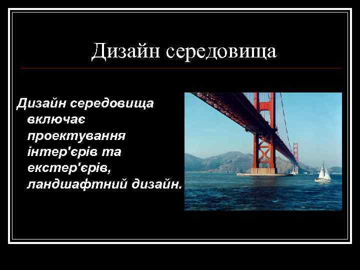 Дизайн середовища включає проектування інтер'єрів та екстер'єрів, ландшафтний дизайн.
