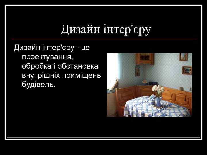 Дизайн інтер'єру - це проектування, обробка і обстановка внутрішніх приміщень будівель.