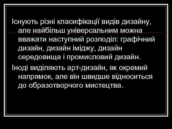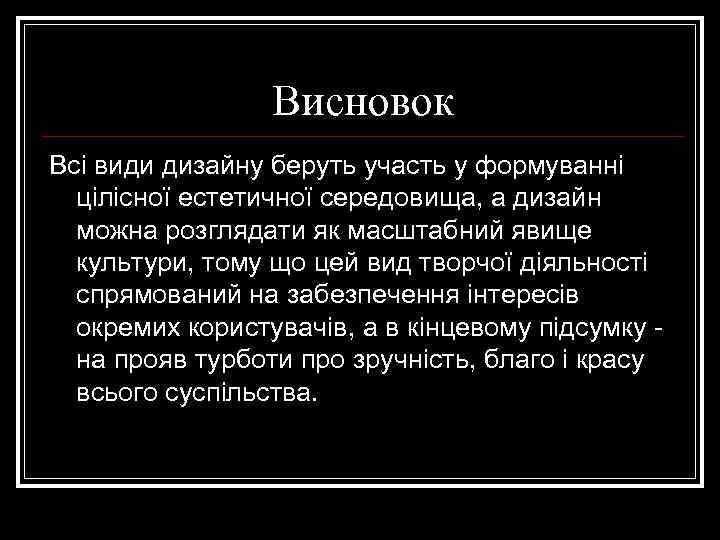 Висновок Всі види дизайну беруть участь у формуванні цілісної естетичної середовища, а дизайн можна розглядати як масштабний явище культури, тому що цей вид творчої діяльності спрямований на забезпечення інтересів окремих користувачів, а в кінцевому підсумку на прояв турботи про зручність, благо і красу всього суспільства.