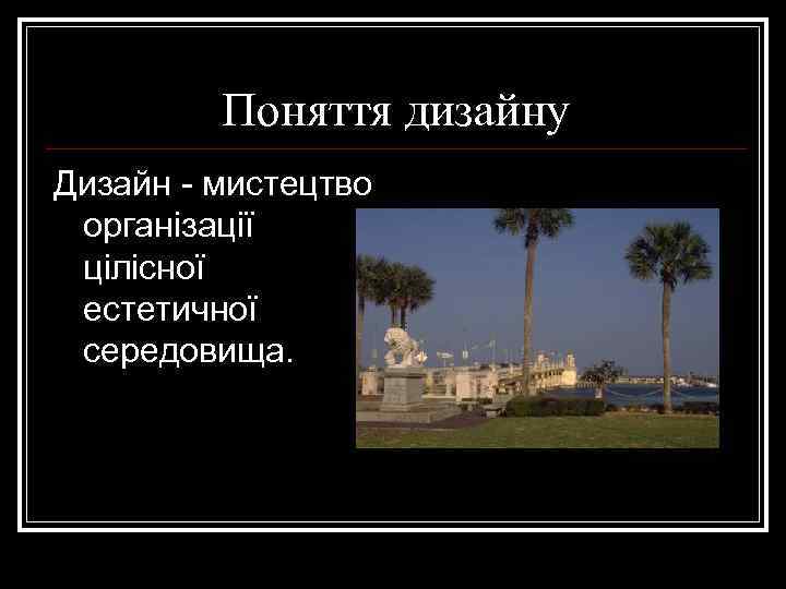 Поняття дизайну Дизайн - мистецтво організації цілісної естетичної середовища.