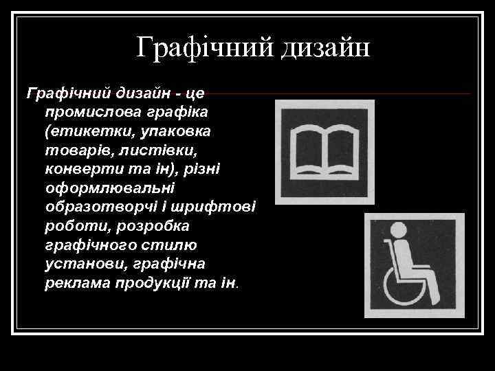 Графічний дизайн - це промислова графіка (етикетки, упаковка товарів, листівки, конверти та ін), різні оформлювальні образотворчі і шрифтові роботи, розробка графічного стилю установи, графічна реклама продукції та ін.