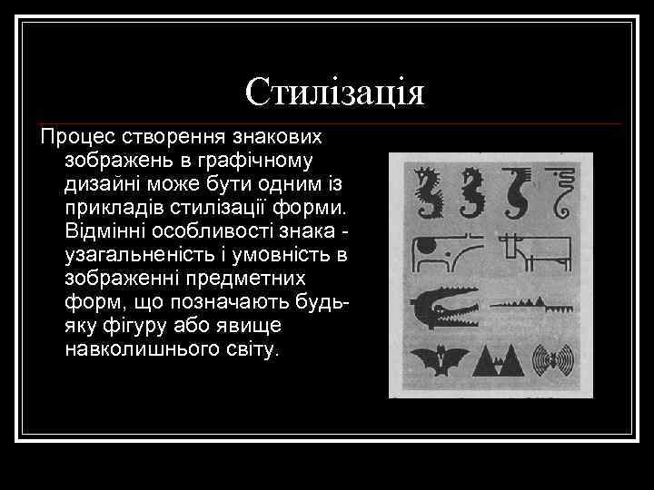 Стилізація Процес створення знакових зображень в графічному дизайні може бути одним із прикладів стилізації форми. Відмінні особливості знака узагальненість і умовність в зображенні предметних форм, що позначають будьяку фігуру або явище навколишнього світу.