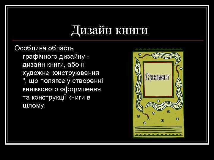 Дизайн книги Особлива область графічного дизайну дизайн книги, або її художнє конструювання ", що полягає у створенні книжкового оформлення та конструкції книги в цілому.
