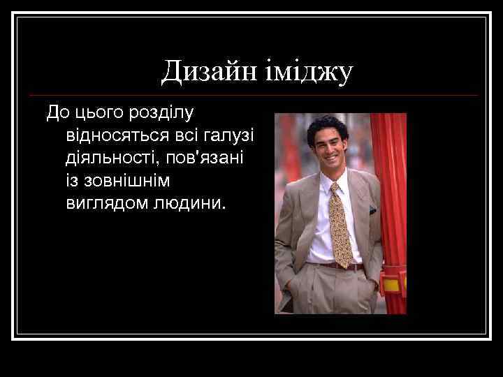 Дизайн іміджу До цього розділу відносяться всі галузі діяльності, пов'язані із зовнішнім виглядом людини.