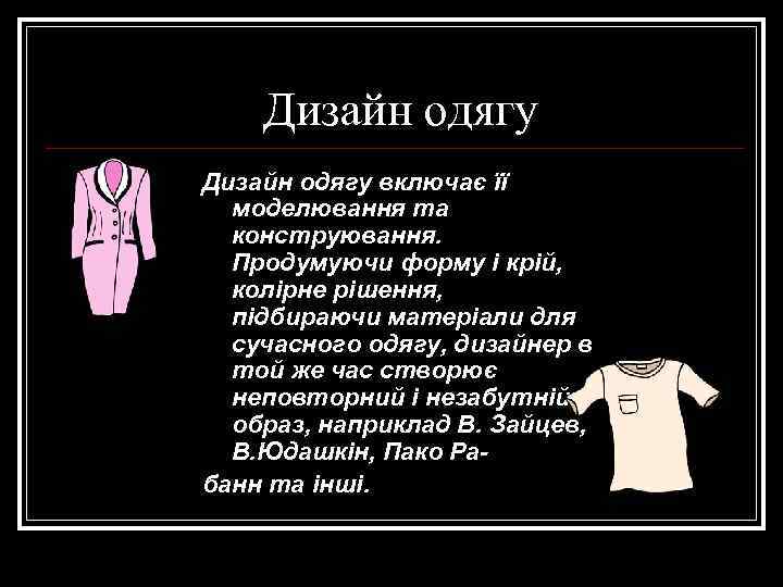 Дизайн одягу включає її моделювання та конструювання. Продумуючи форму і крій, колірне рішення, підбираючи матеріали для сучасного одягу, дизайнер в той же час створює неповторний і незабутній образ, наприклад В. Зайцев, В. Юдашкін, Пако Рабанн та інші.