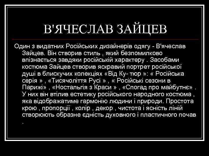 В'ЯЧЕСЛАВ ЗАЙЦЕВ Один з видатних Російських дизайнерів одягу - В'ячеслав Зайцев. Він створив стиль , який безпомилково впізнається завдяки російській характеру. Засобами костюма Зайцев створив яскравий портрет російської душі в блискучих колекціях «Від Ку- тюр » : « Російська серія » , «Тисячоліття Русі » , « Російські сезони в Парижі» , «Ностальгія з Краси » , «Спогад про майбутнє» . У них він втілив естетику російського народного костюма , яка відображатиме гармонію людини і природи. Простота крою , пропорції , колір , декор , чистота і ясність ліній створюють образне єдність духовного і пластичного почав.