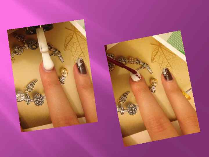 Покрываем ноготь прозрачным лаком, не дожидаясь пока он высохнет, у линии улыбки темным цветом в хаотичном порядке(в зависимости от того где и с каким наклоном, вы хотите рисунок)делаем точки