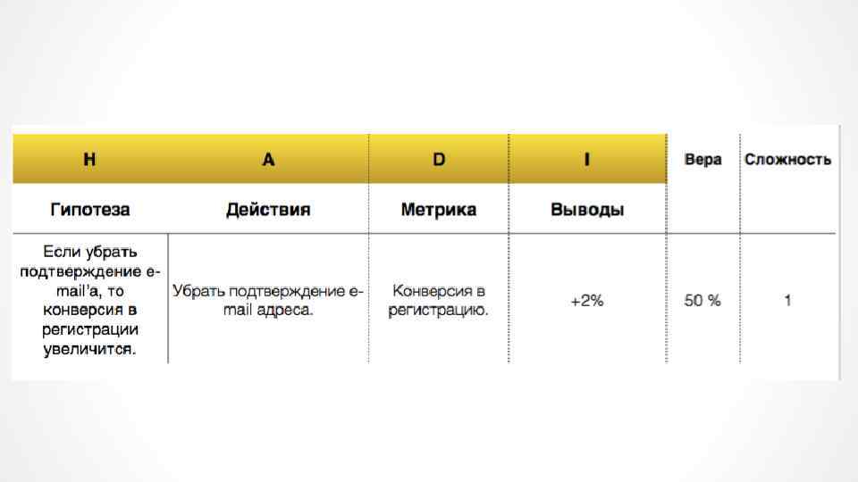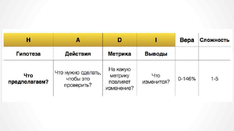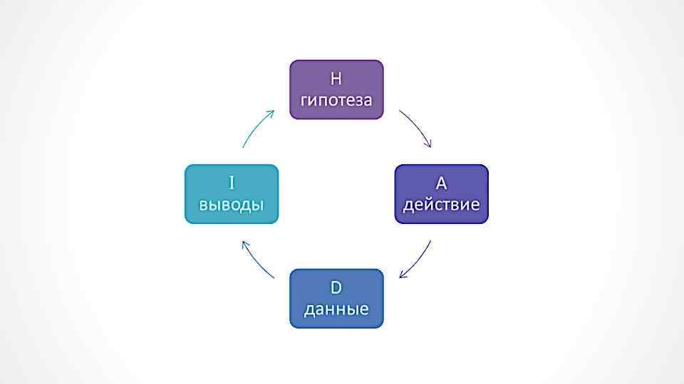 H (Гипотеза) A (Действие) D (Метрика) I (Ожидаемый эффект) Вера в эффект (от 0% до 100%) Сложность реализации (от 0 до 5) HADI-цикл основан на цикл Деминга PDCA (Plan-Do-Check-Act) планирование-действие-проверка-корректировка
