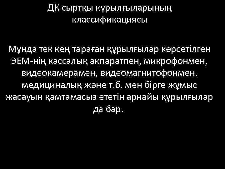 ДК сыртқы құрылғыларының классификациясы Мұнда тек кең тараған құрылғылар көрсетілген ЭЕМ-нің кассалық ақпаратпен, микрофонмен, видеокамерамен, видеомагнитофонмен, медициналық және т. б. мен бірге жұмыс жасауын қамтамасыз ететін арнайы құрылғылар да бар.