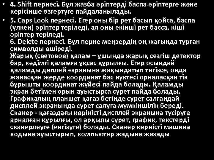 • 4. Shift пернесі. Бұл жазба әріптерді баспа әріптерге және керісінше өзгертуге пайдаланылады. • 5. Caps Look пернесі. Егер оны бір рет басып қойса, баспа (үлкен) әріптер теріледі, ал оны екінші рет басса, кіші әріптер теріледі. 6. Delete пернесі. Бұл перне меңзердің оң жағында тұрған символды өшіреді. Жарық (световое) қалам – ұшында жарық сезгіш детектор бар, кәдімгі қаламға ұқсас құрылғы. Егер осындай қаламды диплей экранына жақындатып тигізсе, онда жанасқан жерде координат бас нүктесі орналасқан тік бұрышты координат жүйесі пайда болады. Қаламды экран бетімен орын ауыстырса сурет пайда болады. Графикалық планшет қағаз бетінде сурет салғандай дисплей экранында сурет салуға мүмкіншілік береді. Сканер - қағаздағы көріністі дисплей экранына түсіруге арналған құрылғы, ол арқылы сурет, график, текстерді сканерлеуге (енгізуге) болады. Сканер көрністі машина кодына ауыстырып, компьютер жадына жазады