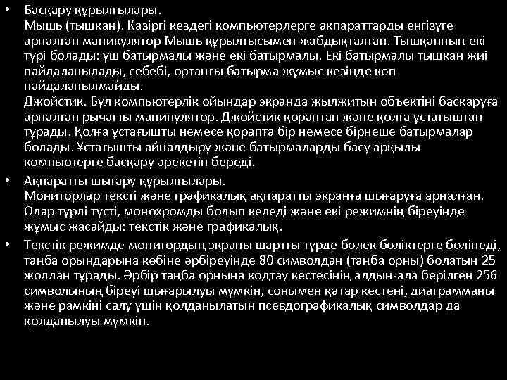 • Басқару құрылғылары. Мышь (тышқан). Қазіргі кездегі компьютерлерге ақпараттарды енгізуге арналған маникулятор Мышь құрылғысымен жабдықталған. Тышқанның екі түрі болады: үш батырмалы және екі батырмалы. Екі батырмалы тышқан жиі пайдаланылады, себебі, ортаңғы батырма жұмыс кезінде көп пайдаланылмайды. Джойстик. Бұл компьютерлік ойындар экранда жылжитын объектіні басқаруға арналған рычагты манипулятор. Джойстик қораптан және қолға ұстағыштан тұрады. Қолға ұстағышты немесе қорапта бір немесе бірнеше батырмалар болады. Ұстағышты айналдыру және батырмаларды басу арқылы компьютерге басқару әрекетін береді. • Ақпаратты шығару құрылғылары. Мониторлар тексті және графикалық ақпаратты экранға шығаруға арналған. Олар түрлі түсті, монохромды болып келеді және екі режимнің біреуінде жұмыс жасайды: текстік және графикалық. • Текстік режимде монитордың экраны шартты түрде бөлек бөліктерге бөлінеді, таңба орындарына көбіне әрбіреуінде 80 символдан (таңба орны) болатын 25 жолдан тұрады. Әрбір таңба орнына кодтау кестесінің алдын-ала берілген 256 символының біреуі шығарылуы мүмкін, сонымен қатар кестені, диаграмманы және рамкіні салу үшін қолданылатын псевдографикалық символдар да қолданылуы мүмкін.