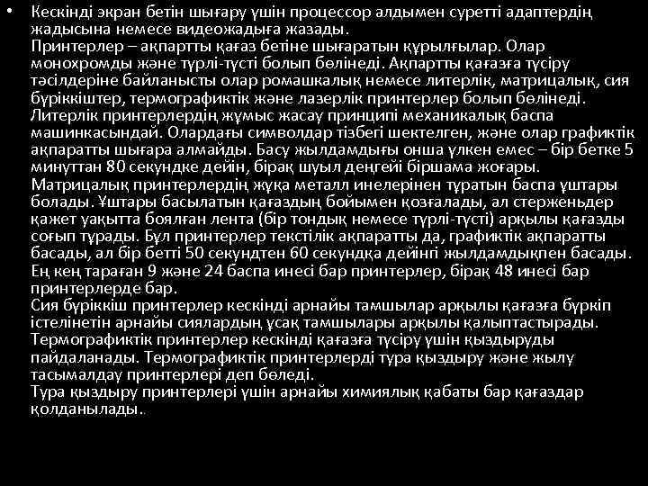 • Кескінді экран бетін шығару үшін процессор алдымен суретті адаптердің жадысына немесе видеожадыға жазады. Принтерлер – ақпартты қағаз бетіне шығаратын құрылғылар. Олар монохромды және түрлі-түсті болып бөлінеді. Ақпартты қағазға түсіру тәсілдеріне байланысты олар ромашкалық немесе литерлік, матрицалық, сия бүріккіштер, термографиктік және лазерлік принтерлер болып бөлінеді. Литерлік принтерлердің жұмыс жасау принципі механикалық баспа машинкасындай. Олардағы символдар тізбегі шектелген, және олар графиктік ақпаратты шығара алмайды. Басу жылдамдығы онша үлкен емес – бір бетке 5 минуттан 80 секундке дейін, бірақ шуыл деңгейі біршама жоғары. Матрицалық принтерлердің жұқа металл инелерінен тұратын баспа ұштары болады. Ұштары басылатын қағаздың бойымен қозғалады, ал стерженьдер қажет уақытта боялған лента (бір тондық немесе түрлі-түсті) арқылы қағазды соғып тұрады. Бұл принтерлер текстілік ақпаратты да, графиктік ақпаратты басады, ал бір бетті 50 секундтен 60 секундқа дейінгі жылдамдықпен басады. Ең кең тараған 9 және 24 баспа инесі бар принтерлер, бірақ 48 инесі бар принтерлерде бар. Сия бүріккіш принтерлер кескінді арнайы тамшылар арқылы қағазға бүркіп істелінетін арнайы сиялардың ұсақ тамшылары арқылы қалыптастырады. Термографиктік принтерлер кескінді қағазға түсіру үшін қыздыруды пайдаланады. Термографиктік принтерлерді тура қыздыру және жылу тасымалдау принтерлері деп бөледі. Тура қыздыру принтерлері үшін арнайы химиялық қабаты бар қағаздар қолданылады. .