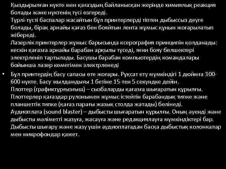 Қыздырылған нүкте мен қағаздың байланысқан жерінде химиялық реакция болады және нүктенің түсі өзгереді. Түрлі-түсті баспалар жасайтын бұл принтерлерді тіптен дыбыссыз деуге болады, бірақ арнайы қағаз бен бояйтын лента жұмыс құнын жоғарылатып жібереді. Лазерлік принтерлер жұмыс барысында ксерография принципін қолданады: кескін қағазға арнайы барабан арқылы түседі, яғни бояу бөлшектері электрленіп тартылады. Басушы барабан компьютердің командалары бойынша лазер көмегімен электрленеді • Бұл принтердің басу сапасы өте жоғары. Рұқсат ету мүмкіндігі 1 дюймға 300600 нүкте. Басу жылдамдығы 1 бетіне 15 -тен 5 секундке дейін. Плоттер (графиктұрғызғыш) – сызбаларды қағазға шығаратын құрылғы. Плоттерлер қағаздар рулонымен жұмыс істейтін барабандық типке және планшеттік типке (қағаз парағы жазық столда жатады) бөлінеді. Аудиоплата (sound blaster) – дыбысты шығаратын құрылғы. Оның әуенді және дыбысты мәліметті жазуға, жасауға және редакциялауға мүмкіндіктері бар. Дыбысты шығару және жазу үшін аудиоплатадан басқа дыбыстық колонкалар мен микрофондар қажет.