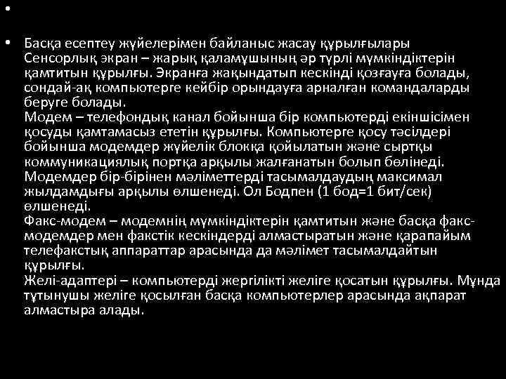 • • Басқа есептеу жүйелерімен байланыс жасау құрылғылары Сенсорлық экран – жарық қаламұшының әр түрлі мүмкіндіктерін қамтитын құрылғы. Экранға жақындатып кескінді қозғауға болады, сондай-ақ компьютерге кейбір орындауға арналған командаларды беруге болады. Модем – телефондық канал бойынша бір компьютерді екіншісімен қосуды қамтамасыз ететін құрылғы. Компьютерге қосу тәсілдері бойынша модемдер жүйелік блокқа қойылатын және сыртқы коммуникациялық портқа арқылы жалғанатын болып бөлінеді. Модемдер бір-бірінен мәліметтерді тасымалдаудың максимал жылдамдығы арқылы өлшенеді. Ол Бодпен (1 бод=1 бит/сек) өлшенеді. Факс-модем – модемнің мүмкіндіктерін қамтитын және басқа факсмодемдер мен факстік кескіндерді алмастыратын және қарапайым телефакстық аппараттар арасында да мәлімет тасымалдайтын құрылғы. Желі-адаптері – компьютерді жергілікті желіге қосатын құрылғы. Мұнда тұтынушы желіге қосылған басқа компьютерлер арасында ақпарат алмастыра алады.