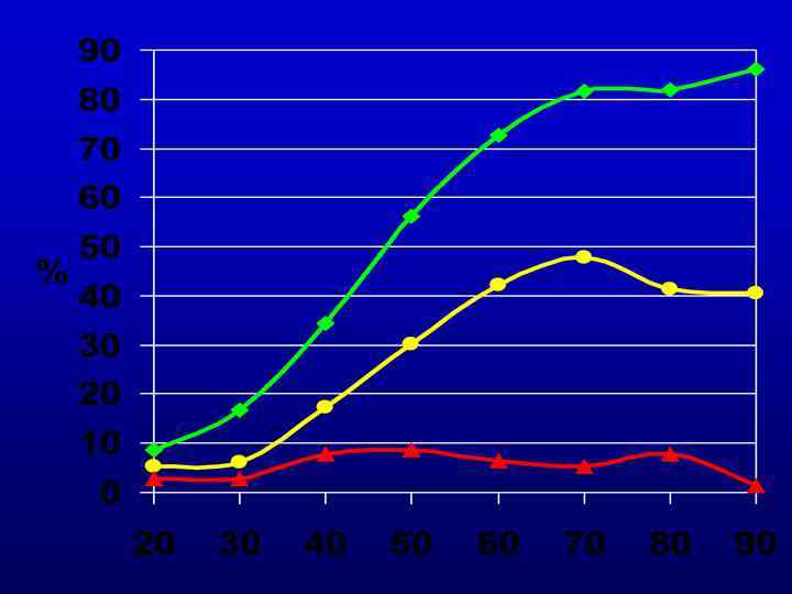 распространенность артериальной гипертонии в Российской Федерации 100 % АД>=140/90 мм рт. ст. 80 60 40 20 0 Мужчины Женщины 20 30 40 50 Возрастные 60 70 80 90 группы Российская национальная репрезентативная выборка