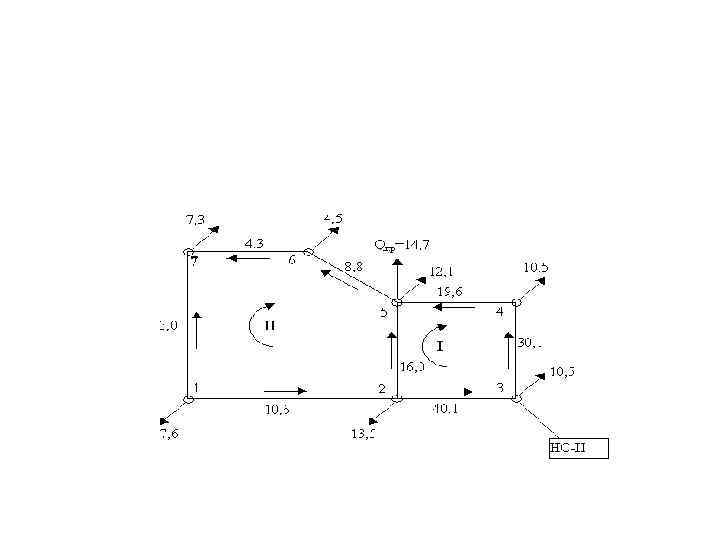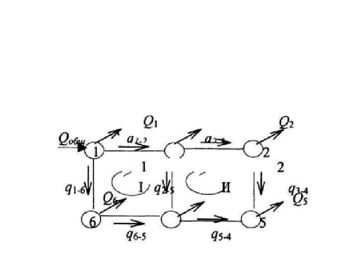 Рассмотрим, как движется вода в кольцевой сети. Для примера возьмем однокольцевую сеть с питанием в точке 1. Предположим, что узловые отборы воды известны. Для того, чтобы определить расчетные расходы, необходимо знать направление движения воды по отдельным участкам.