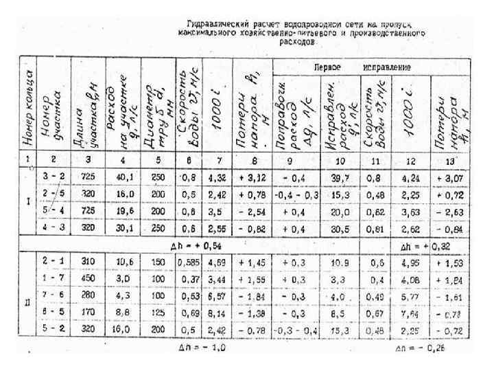 Если бы положение точки схода потоков было известно, то расчет кольцевой сети сводился бы к расчету двух тупиков. Но положение точки схода неизвестно, поэтому гидравлический расчет, кроме определения диаметров и потерь напора на всех участках трубопроводов, должен в результате показать и место схода потоков.