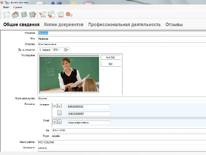 Электронное портфолио учителя Конструктор электронного портфолио состоит из: • Форм (по разделам и по временным отрезкам) • Набора инструментов для произвольного заполнения (в свободной форме) • Программы оценки портфолио