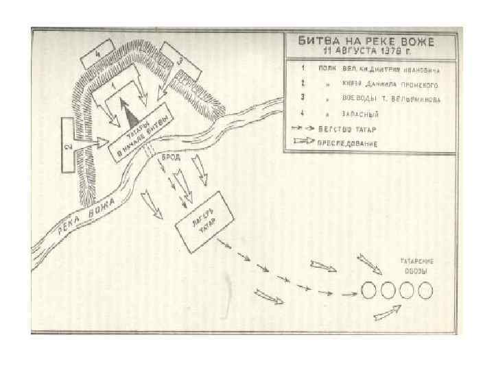 Последствия битвы: 1)Битва на Воже стала первой серьёзной победой войск Северо-Восточной Руси над большим войском Золотой Орды. 2) Имела большое психологическое значение. 3)Она продемонстрировала уязвимость татарской конницы, которая не выдержала стойкой обороны и решительных ответных ударов. 4)Для Мамая поражение на Воже от князя Дмитрия Ивановича стало серьёзным ударом, после которого он стал стремительно терять своё положение в пользу Тохтамыша.