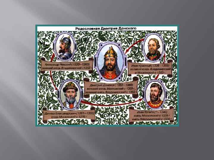 Первые годы правления Выдающийся государственный деятель и полководец Древней Руси Дмитрий Иванович Донской родился 12 октября 1350 года в семье московского князя Ивана II Красного. После смерти отца в 1359 году Дмитрий в девятилетнем возрасте становится великим князем московским (1359), а в двенадцатилетнем возрасте еще и великим князем владимирским (1362), но при его малолетстве фактически главой московского государства был митрополит Алексий, умный и энергичный деятель того времени. Дмитрий Иванович рос в переломный период истории, когда нарастала общая напряженность в отношениях между Русью и Ордой, часто осложнялись отношения между русскими княжествами. В это время на первое место среди русских земель и княжеств выдвинулась Москва.