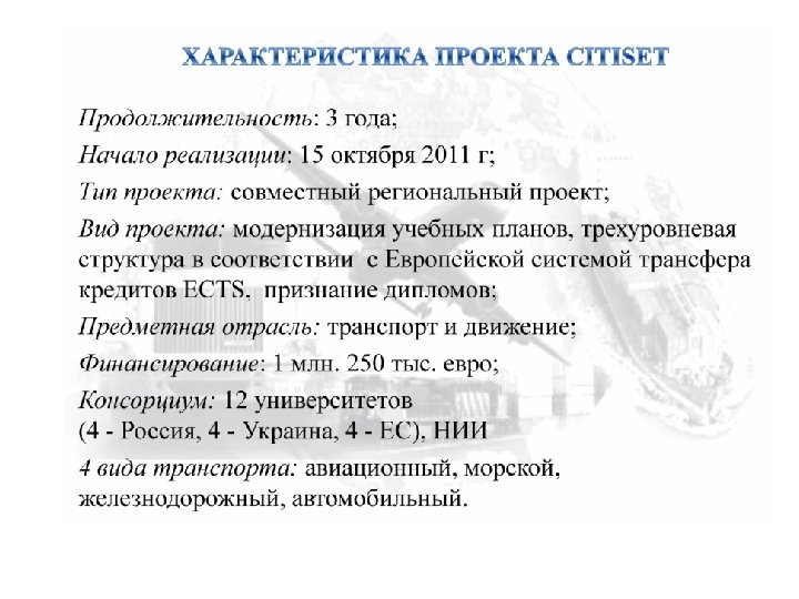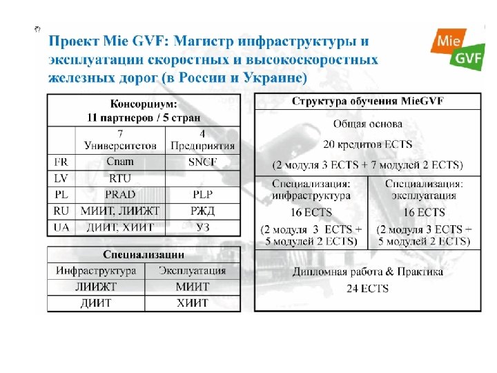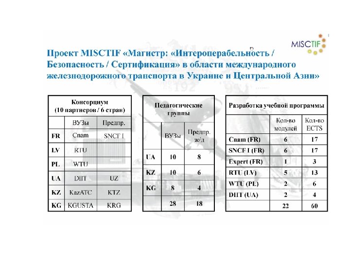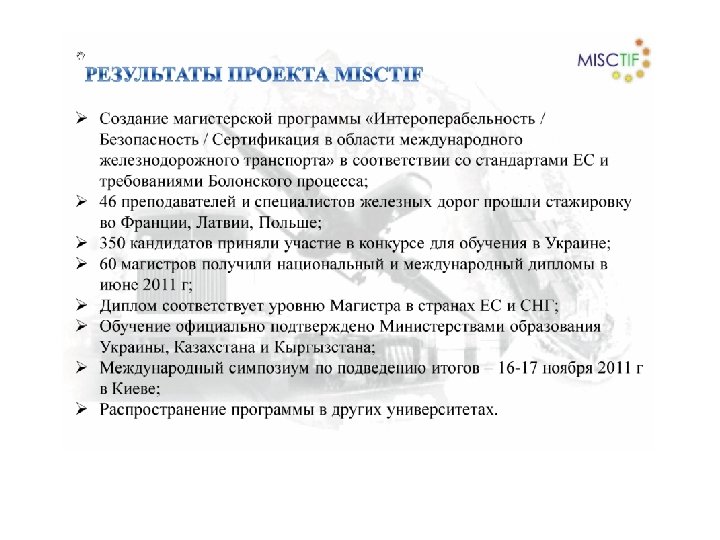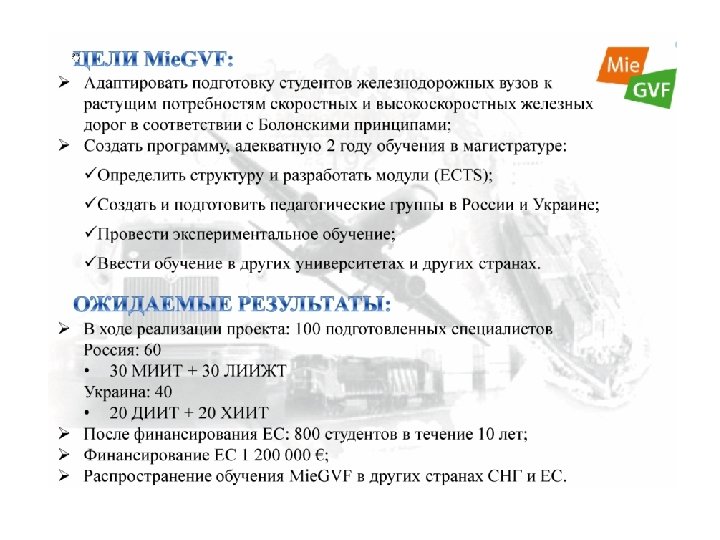 ДНЕПРОПЕТРОВСЬКИЙ НАЦИОНАЛЬНЫЙ УНИВЕРСИТЕТ ЖЕЛЕЗНОДОРОЖНОГО ТРАНСПОРТА ИМЕНИ АКАДЕМИКА ЛАЗАРЯНА В ноябре 2008 г. университет вместе с Укрзализныцей и университетами и государственными железными Франции, Польши, Латвии, Казахстана и Киргизии получили от Европейской комиссии грант на реализацию совместного европейского проекта «Магистр: "Интероперабельность/Безопасность/Сертификац ия» в области между-народного железнодорожного транспорта в Украине и Центральной Азии» (MISCTIF) по программе TEMPUS. В 2011 г. университет начал реализацию магистерского проекта: «Коммуникационные и информационные технологии для обеспечения безопасности и эффективности транспортных потоков европейско-российско-украинская магистерская и докторская программа в области интеллектуальных транспортных систем» (CITISET), а с 2012 г. «Магистр инфраструктуры и эксплуатации высокоскоростного железнодорожного транспорта в России и Украине» (Mie. GVF). 49010, Украина, г. Днепропетровск, ул. Лазаряна, 2 Тел: +38(056) 776 -59 -47, +38(056) 776 -84 -98, факс: +38(0562) 47 -18 -66, http: //ndch. diit. edu. ua e-mail: dnuzt@diit. edu. ua, vnti@ndc. diit. edu. ua