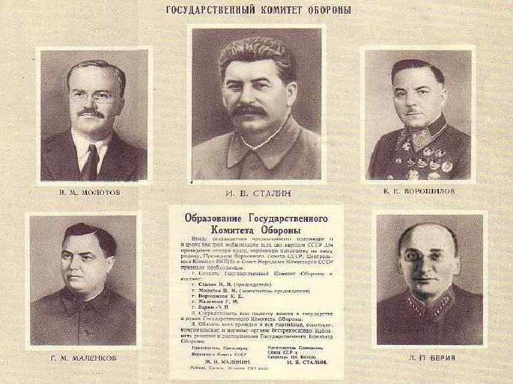 Первоначальный состав Председатель – Сталин И. В. Заместитель председателя – Молотов В. М. Ворошилов К. Е. Берия Л. П. Маленков Г. М.