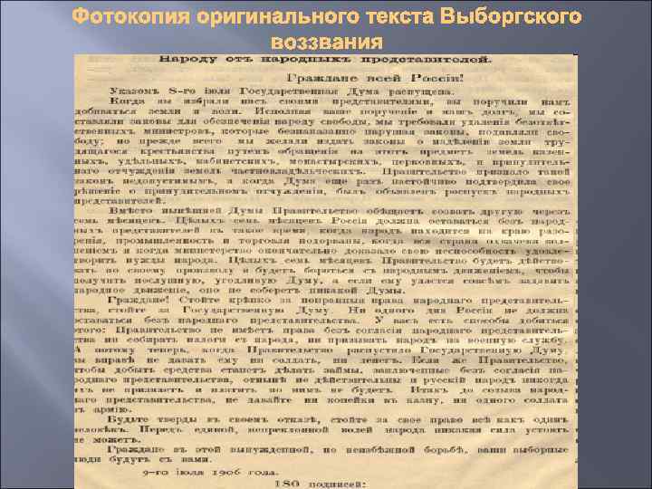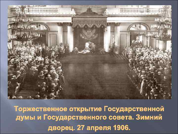 Первая Государственная Дума Решение царской власти об учреждении в России Государственной Думы было принято летом 1905 года, в разгар первой русской революции. Самодержавие было вынуждено пойти на уступки революционным и либеральнодемократическим силам, что бы сбить революционный накал в стране. 6 августа 1905 г. Вышел Манифест императора Николая II об учреждении в Российской империи Государственной Думы. Император Николай II
