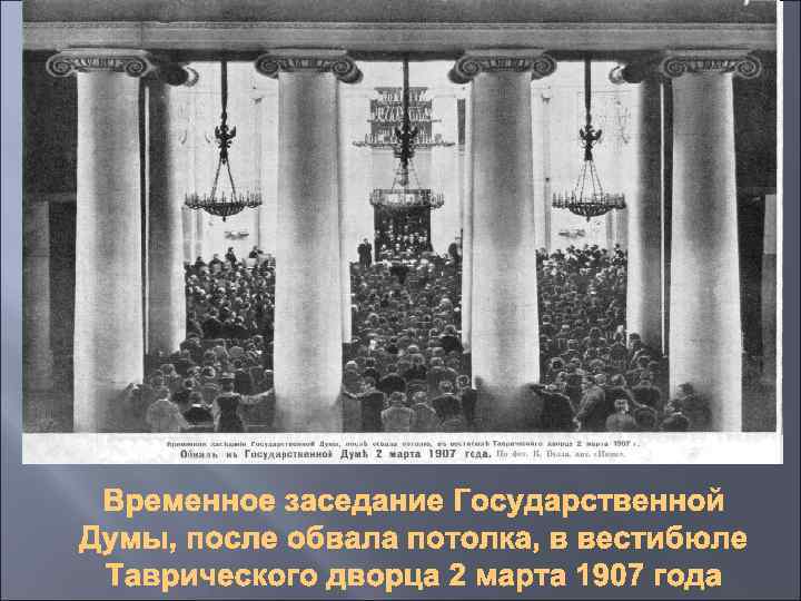 В ночь на 2 марта случилась катастрофа — в зале заседаний рухнул потолок… Когда я утром приехал, я увидал на наших местах груды штукатурки. Этот недосмотр архитекторов вызвал в депутатах бурю негодования. А депутаты-крестьяне от радости, что избегли смертельной опасности, просили меня отслужить для них благодарственный молебен. Для заседаний был спешно приспособлен другой зал Таврического дворца — и загремели зажигательные речи… Обвал потолка дал повод для возмущения деятельностью правительства, а в катастрофе готовы были видеть чуть ли не злой умысел. «Граждане депутаты! Когда я пришел сюда, я нисколько не удивился известию о том, что обвалился потолок над местами, где должны были заседать народные представители. Я уверен, что потолки крепче всего в министерствах, в Департаменте полиции и в других учреждениях» , — кричал с трибуны Григорий Александрович Алексинский (социал-демократ). (Шум. Аплодисменты. ) Правда, некоторые ораторы приводили и благоразумные доводы: правительство не виновато, был лишь недосмотр и т. д. ; но они явно противоречили возбуждённому настроению левых депутатов.