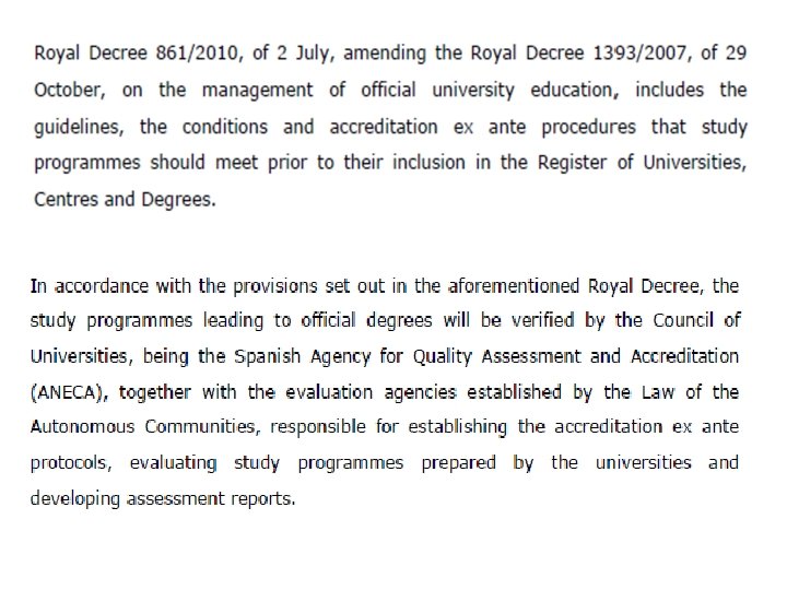 THE SPANISH AGENDA The Spanish Context: Space Public universities funding in Spain is regional based while HE regulation is a competence of the national authorities. University autonomy is in the Spanish Constitution. 78 universities (50+28), 17 autonomous regions, 1. 500. 000 students at Spanish Universities, . . . ANECA, 4 QA regional agencies in ENQA&EQAR, 6 QA regional agencies, ….