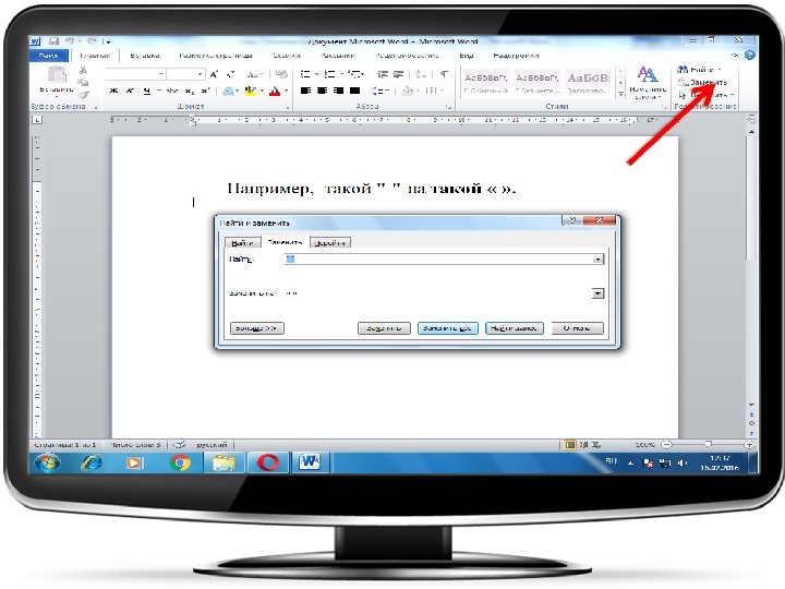 Ручной режим автозамены слова или символа в тексте В процессе работы над текстом может возникнуть необходимость замены слов или символов на другие в большом отрывке текста. Например, такой символ" " на такой « » . Чтобы ускорить процесс замены, нажимаем на Главной странице значок «Заменить» . В открывшееся окно вносим слово или символ, которые нужно найти и на какое слово или символ заменить. Нажимаем «Заменить все» и подтверждаем.