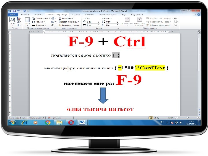 Число или сумма прописью Создаем или открываем документ и в том месте, где необходимо вывести числовое значение прописью, ставим курсор и нажимаем комбинацию клавиш Ctrl + F 9. В тексте появится затененное поле с фигурными скобками. Внутри фигурных скобок вставьте следующую конструкцию: {=1500 *Card. Text}, где 1500 - это любое ваше число (не забывайте про знак равенства перед числом), *Card. Text - это ключ поля. Затем нажмите клавишу F 9. В результате вы увидите представленное прописью ваше число, в данном случае - одна тысяча пятьсот.