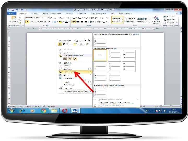 Нумерация Один из способов создания нумерации – это щелкнуть на правую кнопку мышки. Появится список действий. Если навести курсор на «Нумерация» рядом появятся варианты нумерации. После выполнения действий на странице появится первый номер, после того, как напечатаете текст, нажмите «Enter» - появится следующий номер. Кнопка «ТАВ» переводит на следующий уровень нумерации.