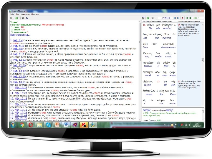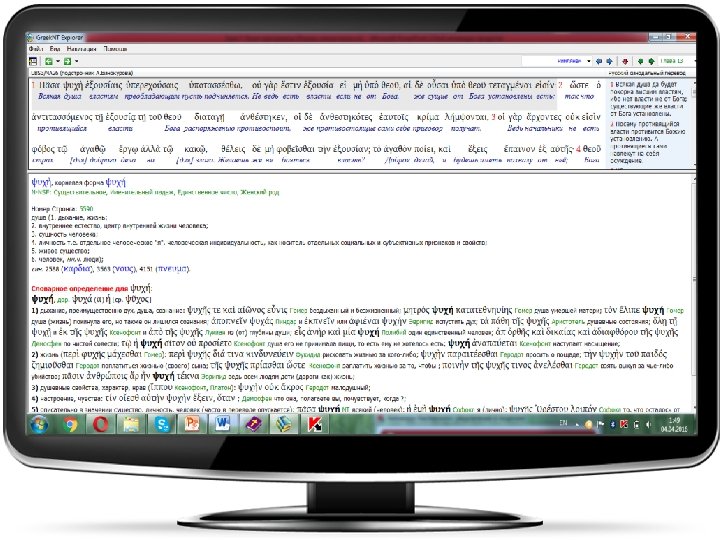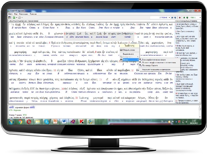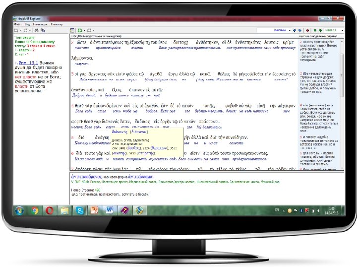 Программа предназначена для изучения книг НЗ на греческом языке. Основные особенности программы: Удобное отображение греческого текста, подстрочника и морфологии слов (мнемоник) в столбик под каждым греческим словом. Всплывающие подсказки к греческим словам с переводом (по словарю Стронга). Параллельный показ текста в Синодальном переводе. Мгновенный контекстный морфологический поиск греческих слов с многостраничным отображением результатов на русском и греческом языках. Для этого нужно щелкнуть правой кнопкой мышки на нужное слово и выбрать в меню параметры поиска.