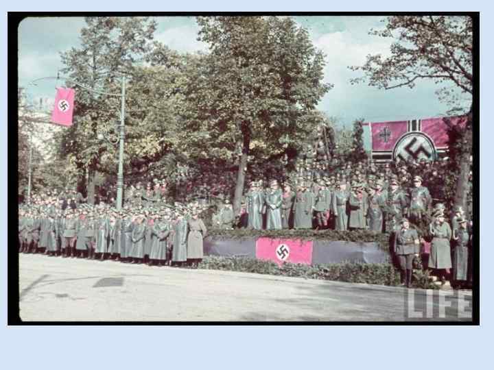 Немецкий фашизм • В 1933 году запрещены все политические партии кроме НСДАП • Была создана тайная полиция (гестапо) • По всей Германии создаются концентрационные лагеря • Ликвидированы основные политические права: свобода слова, собраний, неприкосновенности жилища, тайна переписки. • Особенностью экономики стало прямое административное регулирование хозяйства. • Ликвидированы профсоюзы. • Введение всеобщей трудовой повинности: государство должно само определять где должен работать каждый немец. • В Германии было создано тоталитарное государство.