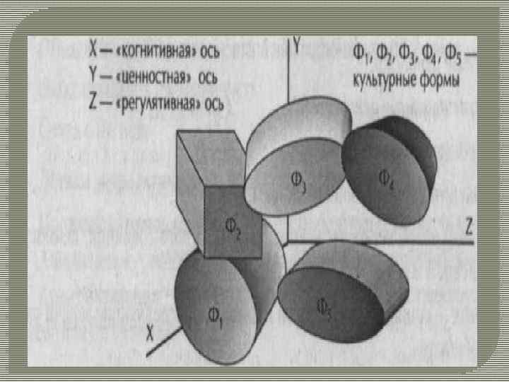 Ф 1, Ф 2, Ф 3 и т. д культурные формы человеческой деятельности, в которых добывается, сохраняется и используется социальная информация. X, Y, Z культурные парадигмы осевые культурные формы: типы знаний, ценностей и регулятивов.
