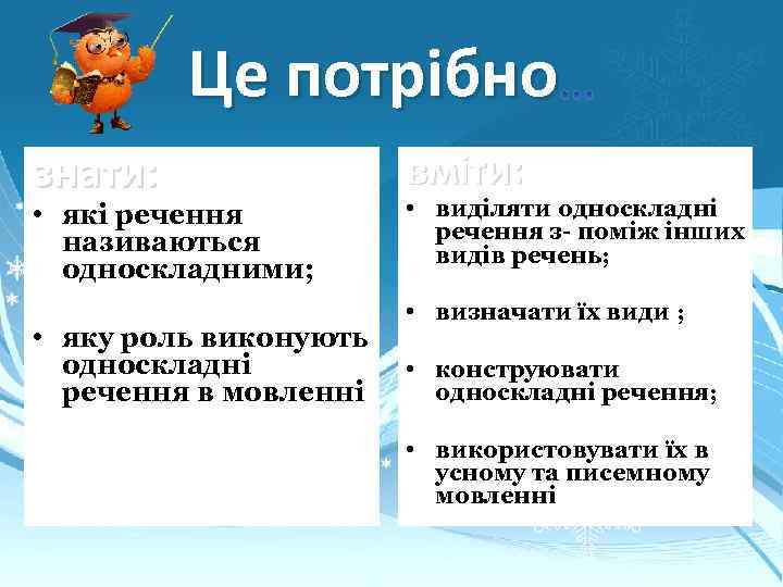 Це потрібно знати: • які речення називаються односкладними; • яку роль виконують односкладні речення в мовленні вміти: • виділяти односкладні речення з- поміж інших видів речень; • визначати їх види ; • конструювати односкладні речення; • використовувати їх в усному та писемному мовленні