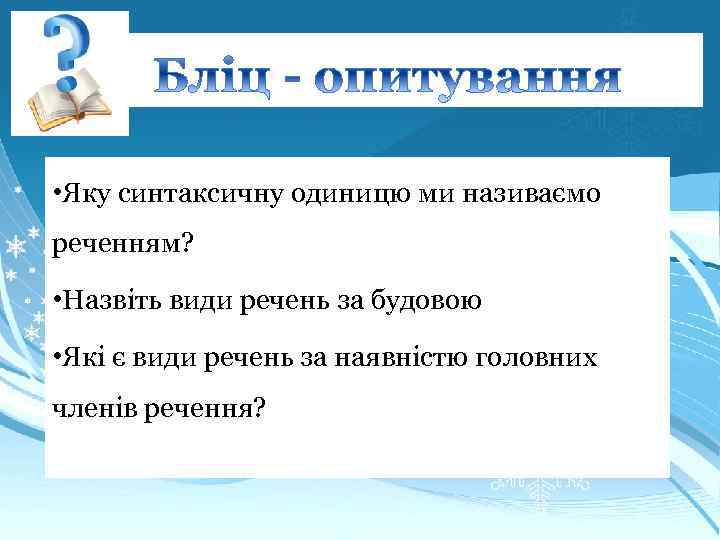 • Яку синтаксичну одиницю ми називаємо реченням? • Назвіть види речень за будовою • Які є види речень за наявністю головних членів речення?