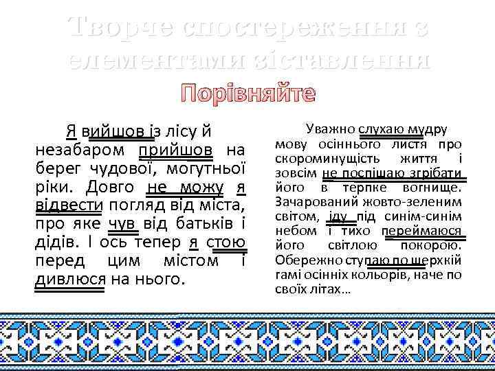 Творче спостереження з елементами зіставлення Порівняйте Я вийшов із лісу й незабаром прийшов на берег чудової, могутньої ріки. Довго не можу я відвести погляд від міста, про яке чув від батьків і дідів. І ось тепер я стою перед цим містом і дивлюся на нього. Уважно слухаю мудру мову осіннього листя про скороминущість життя і зовсім не поспішаю згрібати його в терпке вогнище. Зачарований жовто-зеленим світом, іду під синім-синім небом і тихо переймаюся його світлою покорою. Обережно ступаю по шерхкій гамі осінніх кольорів, наче по своїх літах…