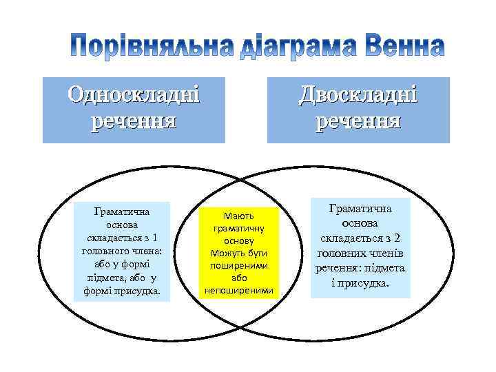 Односкладні речення Граматична основа складається з 1 головного члена: або у формі підмета, або у формі присудка. Мають граматичну основу Можуть бути поширеними або непоширеними Двоскладні речення Граматична основа складається з 2 головних членів речення: підмета і присудка.