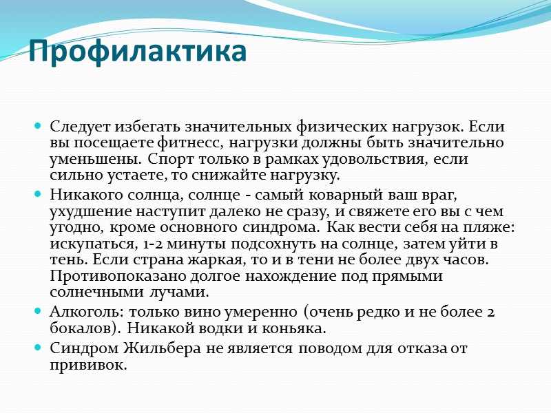 Профилактика Следует избегать значительных физических нагрузок. Если вы посещаете фитнесс, нагрузки должны быть значительно уменьшены. Спорт только в рамках удовольствия, если сильно устаете, то снижайте нагрузку. Никакого солнца, солнце - самый коварный ваш враг, ухудшение наступит далеко не сразу, и свяжете его вы с чем угодно, кроме основного синдрома. Как вести себя на пляже: искупаться, 1-2 минуты подсохнуть на солнце, затем уйти в тень. Если страна жаркая, то и в тени не более двух часов. Противопоказано долгое нахождение под прямыми солнечными лучами. Алкоголь: только вино умеренно (очень редко и не более 2 бокалов). Никакой водки и коньяка. Синдром Жильбера не является поводом для отказа от прививок.