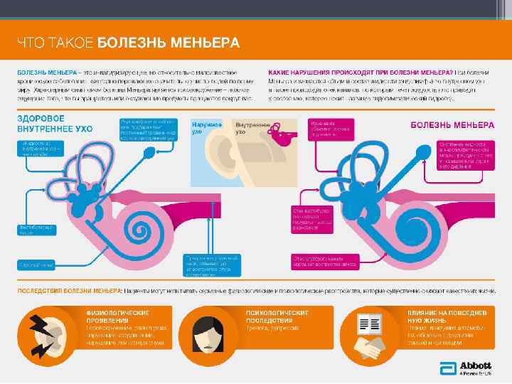 Симптомы болезни Меньера • Приступ выраженного системного головокружения • Отмечается заложенность, распирание и шум в ухе, нарушение координации и равновесия, снижение слуха, одышка, тахикардия, побледнение лица, повышенное потоотделение. • Объективно в период приступа наблюдается ротаторный нистагм. • После приступа болезни Меньера у пациентов некоторое время сохраняется тугоухость, шум в ухе, тяжесть в голове, небольшое нарушение координации, чувство неустойчивости, изменение походки, общая слабость.