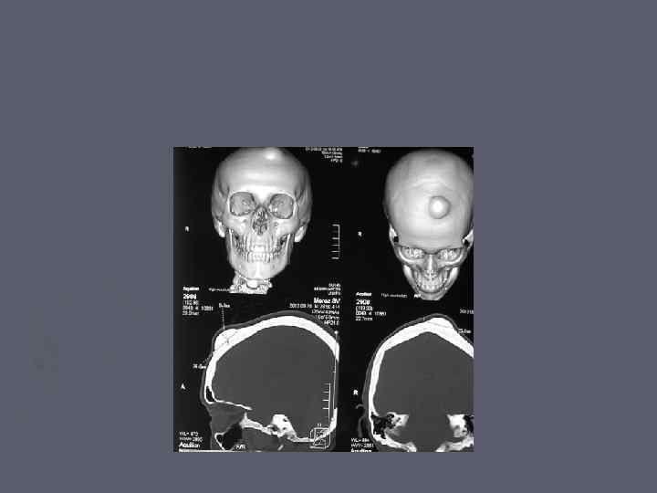 Остеома 15% от всех доброкачественных костных опухолей Выявляется в возрасте от 18 до 40 лет, растет медленно ► Одиночная ► Выделяют три типа – губчатая, компактная и смешанная (медуллярная) ► Типичная локализация – кости черепа ► Имеет костную структуру и общий с окружающей костью кортикальный слой (компактная остеома – гомогенная интенсивная бесструктурная тень) ► Клиника может появляться при сдавлении окружающих тканей ► Не малигнизируется ► Часто рентгенологическая находка ► ►