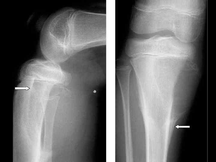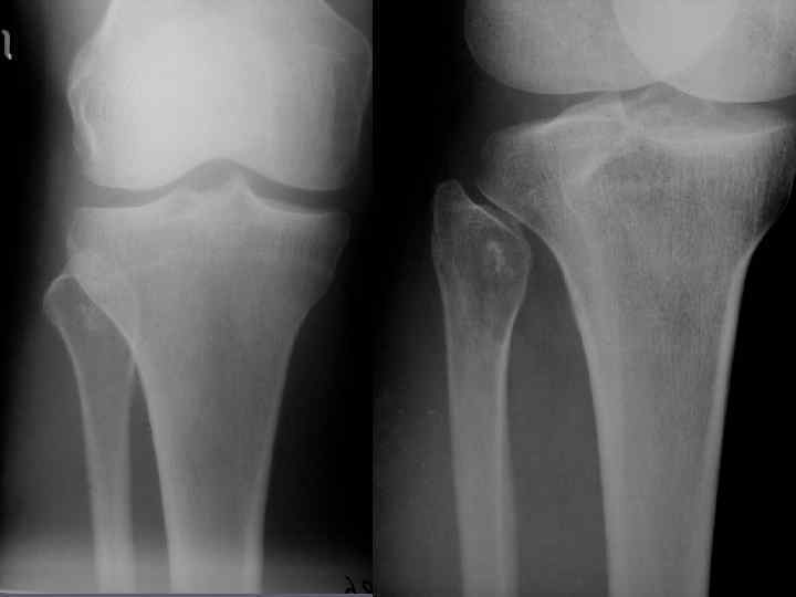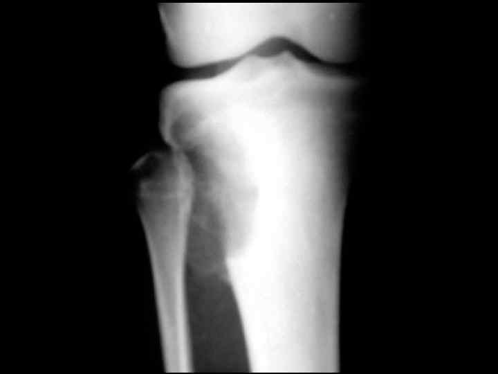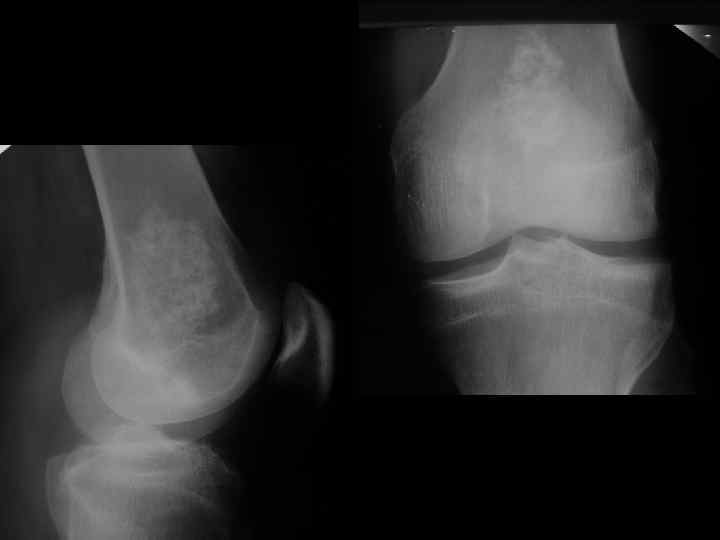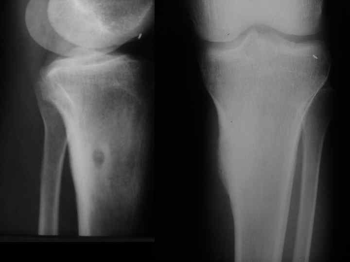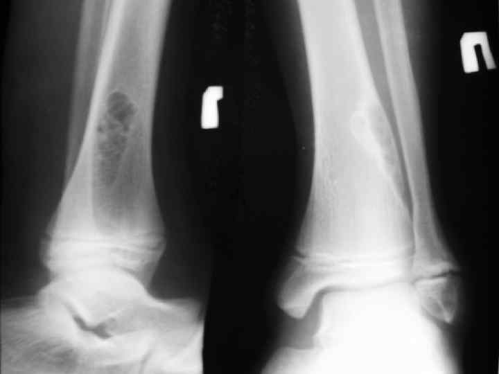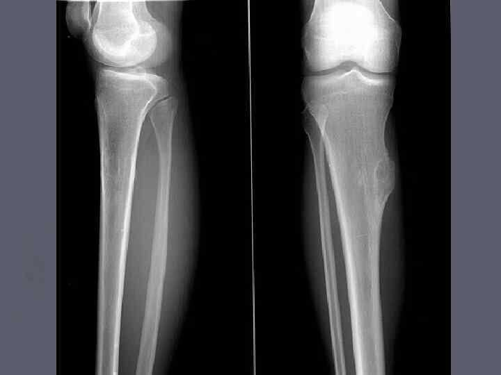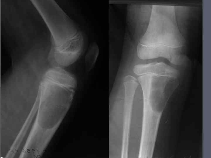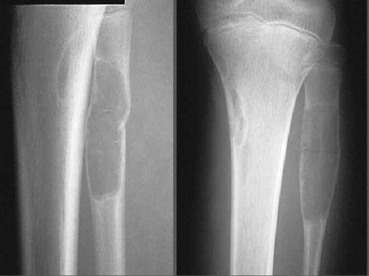 Фиброма (неоссифицирующая фиброма, фиброксантома) ► Выявляется в любом возрасте ► Одиночная ► Исходит из стромы костного мозга, либо наружного слоя надкостницы ► Преимущественная локализация –метадиафиз длинных трубчатых костей ► Выглядит как гомогенный очаг просветления, с четким контуром, легко вздувающий и истончающий кортикальный слой ► Созревание и старение опухоли не сопровождается явлениями оссификации