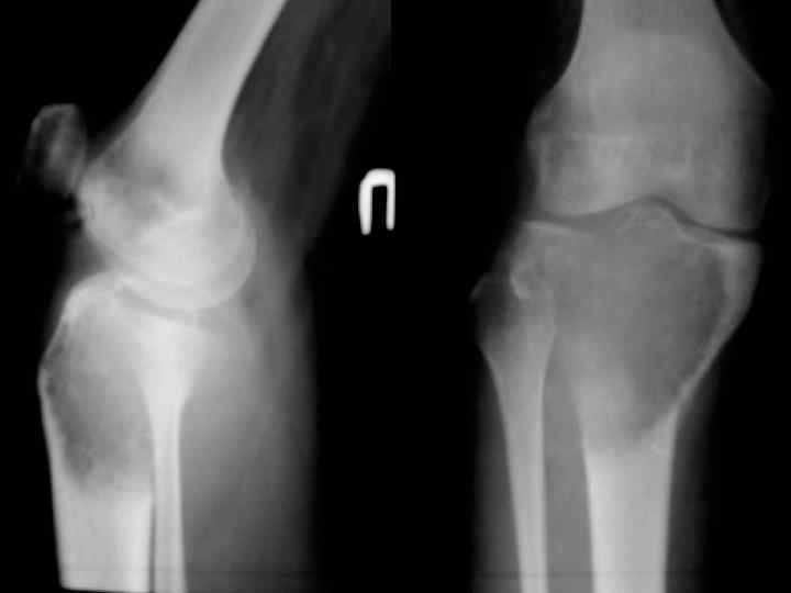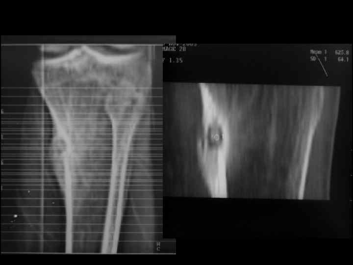 Классическая остеоидостеома При типичной остеоидной остеоме на фоне локального гиперостоза в диафизе выявляется очаг литической деструкции овальной формы, ориентированный по длиннику кости с секвестром в центре.