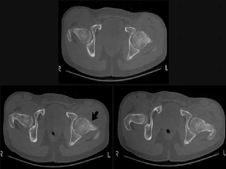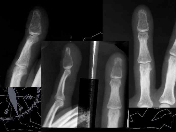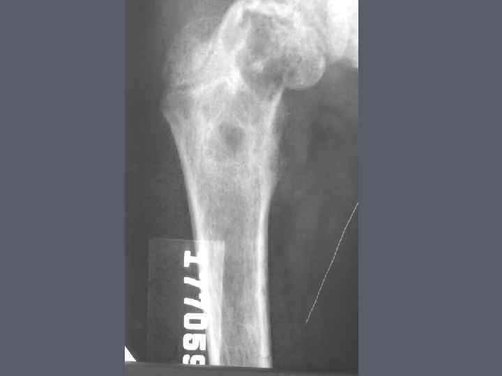 Эозинофильная гранулема (гистиоцитоз из клеток Лангерганца) Локализованная или диссеминированная пролиферация дендритных клеток – аномальный иммунный ответ либо клональный неопластический процесс ► Выявляется в возрасте до 30 лет (чаще от 5 до 10 лет) ► Выделяют моно- и полиоссальную форму ► Поражаются любые кости, чаще плоские (50%), губчатые (30%), проксимальный отдел бедра (20%) ► Локализация любая, может поражаться эпифиз, чаще диафиз ► Выглядит как очаг деструкции, размерами от 0, 5 до 10 см, исходящий из костного мозга и вызывающий прободение компактного слоя, с четким контуром. Может вызывать утолщение эндоста и периоста. ► Дифференцируем с остеомиелитом, миеломой, лимфомой, метастазами ►