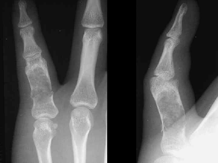 Хондрома До 10 -15% от всех доброкачественных костных опухолей ► Выявляется чаще в возрасте от 10 до 40 лет ► Чаще множественные поражения (двусторонние, не симметричные) ► Малигнизируется в хондросаркому (чаще при локализации в ребрах, длинных трубчатых костях, костях таза) ► Поражаются преимущественно короткие трубчатые кости (фаланги), ребра, грудина, ► Редко - позвонки, кости таза, длинные трубчатые кости ► Солитарные поражения длинных трубчатых костей – дифференцируем с кистой, фибромой, метастазом ►