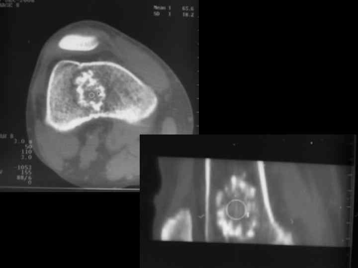 Остеоид - остеома 3 -10% от всех доброкачественных костных опухолей (ранее относили к первично-хроническому остеомиелиту) ► Выявляется чаще в возрасте от 5 до 30 лет ► Одиночная ► Преимущественная локализация – диафизы и метафизы длинных трубчатых костей ► По расположению в кости выделяют кортикальную форму и губчатую форму ► Имеет характерную клинику – нарастающие сильные точечные боли, включая ночные, купирующиеся аспирином ► Выглядит как полость (до 1 см) с плотным ядром внутри ( «нидус» ) на фоне диффузно ассиметрчно утолщенного кортикального слоя ► Не малигнизируется ► Дифференцируем с остеомиелитом, срывом компенсации – по МРТ - (кортикальную форму) ►