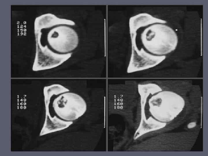 Солитарная костная киста Выявляется в возрасте от 5 до 25 лет Одиночная, как исход ОК, фиброзной дисплазии, травмы или воспаления ► Преимущественная локализация – проксимальный метадиафиз длинных трубчатых костей (плечо, бедро) ► Не переходит через ростковую зону, отодвигается к диафизу с ростом кости ► Располагается по центру, овоидной формы, дает вздутие и истончение кортикального слоя, имеет четкую границу от окружающей кости ► Структура – крупно ячеистая ► Часто осложняется патологическими переломами, после чего и выявляется ► Часто рецидивирует (60%) после оперативного лечения ► ►