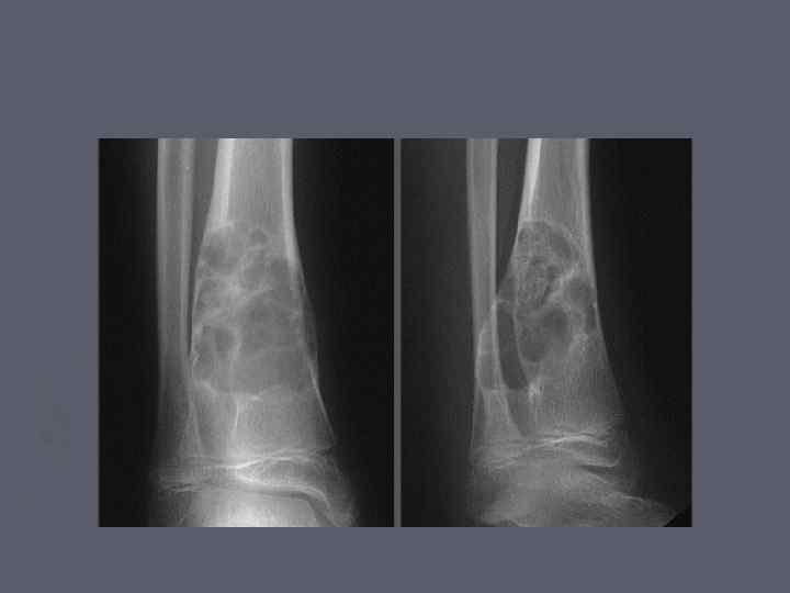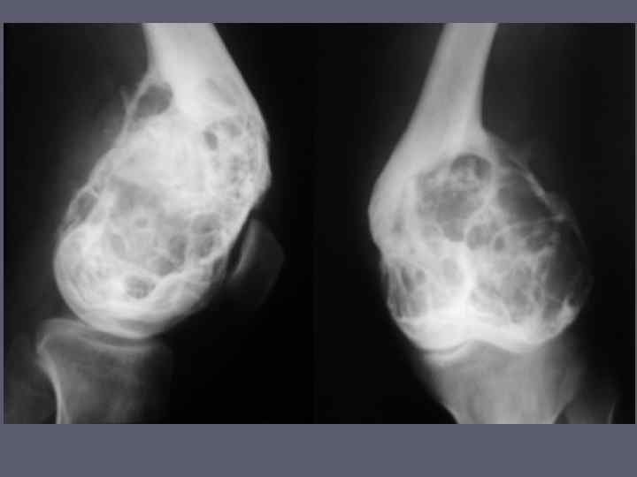Гигантоклеточная опухоль (Остеокластома) 15% от всех доброкачественных костных опухолей Выявляется в возрасте от 20 до 40 лет Одиночная Преимущественная локализация – метаэпифизы длинных трубчатых костей, реже – кости таза, ниж. челюсть, позвонки ► Ячеистый тип опухоли – булавовидное вздутие с ячеистой структурой (соты), истончение кортикального слоя, четкая граница от окружающей кости ► Литический тип – вздутие, полное отсутствие трабекулярного рисунка, дефект кортикального слоя (похоже на метастаз, литическую остеосаркому) ► Часто осложняется патологическими переломами ► Малигнизируется часто ► ►